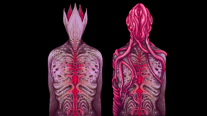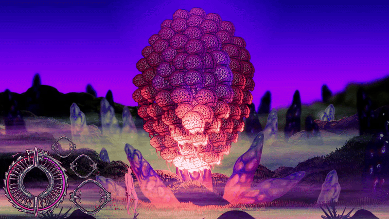 Namtar blends grotesque horror with psychedelic vibrancy, creating a world that is both unsettling and mesmerizing. Inspired by the biomechanical nightmares of H.R. Giger and the dreamlike visions of Moebius, the game uses frame-by-frame animation to bring its alien creatures and landscapes to life. Instead of muted palettes and shadows, it embraces vivid neon hues—pulsating colors, alien flora, and distorted anatomy that feel alive and otherworldly.